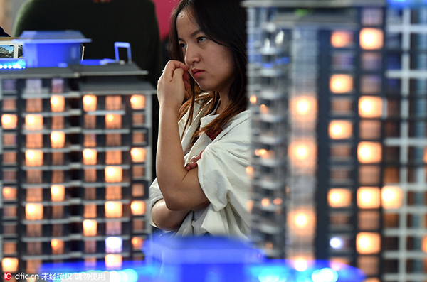 A Chinese homebuyer looks at housing models of a residential property project at a real estate fair in Kunming city, southwest China´s Yunnan province, April 16, 2015. [Photo/IC] |