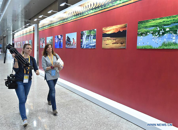 Journalists walk past decorations at the media center of the Belt and Road Forum for International Cooperation in Beijing, capital of China, May 12, 2017.[Photo/Xinhua] |