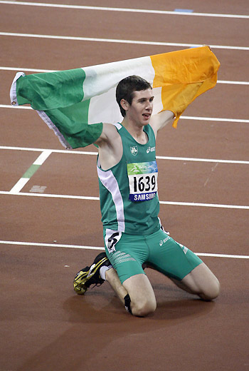 Ireland's Michael McKillop celebrates after winning the men's 800M T37 at the National Stadium, also known as the Bird's Nest, during the Beijing 2008 Paralympic Games September 10, 2008. [Agencies]