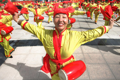 People perform during the inauguration of the world kite capital commemoration square in Weifang, China's Shandong province April 19, 2006. The 23rd Weifang International Kite Festival will be held in Weifang on April 20, 2006. [Reuters]
