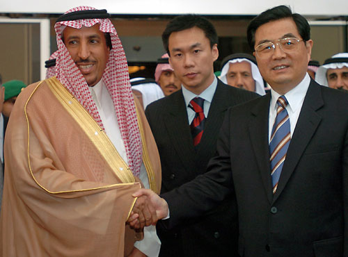 President Hu Jintao (R) shakes hands with Emir Saud al-Thnayan at the end of a visit to Sabek plant in Riyadh April 22, 2006. Hu is here on an official visit. [Reuters]