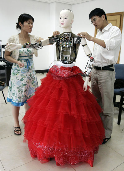 Robot designers assemble "Rong Cheng", a newly-created robot, at the Institute of Automation of Chinese Academy of Sciences in Beijing August 7, 2006. Rong Cheng, dubbed as the first Chinese "beauty" robot, is able to respond to some 1,000 Chinese words. She can dance, bow and greet people in the Sichuan dialect as she is destined for the Sichuan Science Museum to serve as a receptionist. The robot costs about 300,000 yuan (US$37,500) to make, according to Xinhua News. [Reuters]