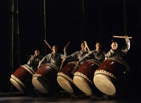 Artists from the U Theatre and the Shaolin Temple Wushu Training Centre of China perform "A Touch of Zen" at the Esplanade in Singapore March 2, 2007. The performance, which is a musical about an orphan who grows up in the Shaolin Temple, is a mix of kung-fu, music and drama. [Reuters]