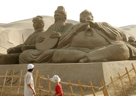Two visitors look at a sand sculpture in the Kumtag Desert in Turpan, a stop along the ancient Silk Road, Northwest China's Xinjiang Uygur Autonomous Region, August 15, 2007. These sand sculptures were created by local artisans to attract tourists before the start of the Turpan Grape Festival. [newsphoto] |