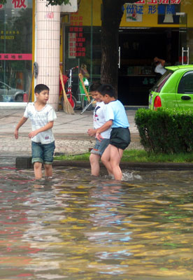 Three boys wade through a flooded street in Winling, East China's Zhejiang Province October 8, 2007. Typhoon Krosa, which has weakened to a tropical storm, lashed Zhejiang on Monday with torrential rains. [Xinhua]