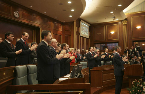 Kosovo's Prime Minister Hashim Thaci (R) speaks during a session of Parliament in Pristina February 17, 2008. Kosovo declared independence from Serbia on Sunday. [Agencies]