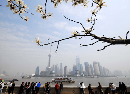 Magnolia flowers blossom on the riverbank opposite of the Lujiazui financial area in Shanghai, as temperatures surpassed 20 degrees Celsius on March 11, 2008. [Xinhua]
