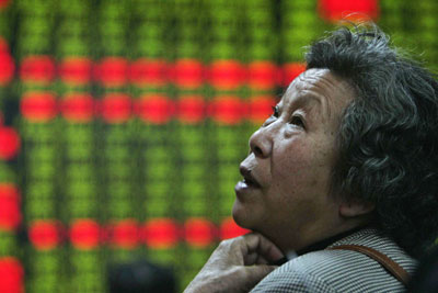 A woman looks at an electronic board at a brokerage house in Shanghai March 13, 2008. China's main stock index tumbled below 4,000 points on Thursday to close at 3971.26 points for the first time in seven months, hit by concern about inflation and the market's ability to absorb large new supplies of shares. [Agencies]