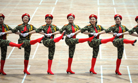 Women perform during a dance contest for amateur dance troupes to promote physical exercise and healthy lifestyle for women in Tianjin, March 15, 2007. [Xinhua]