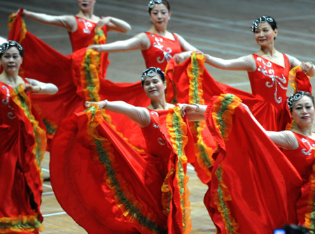 Women perform during a dance contest for amateur dance troupes to promote physical exercise and healthy lifestyle for women in Tianjin, March 15, 2007. [Xinhua]