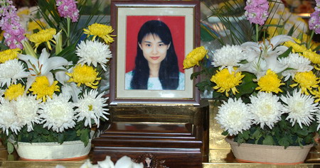 A picture of Xiong Ning is displayed at her funeral in Xi'an, Shaanxi Province, March 16, 2008. Xiong Ning died in a road accident March 10 on her way to distribute disaster relief supplies in Yushu Tibet Automomous Prefecture in Qinghai Province. [Xinhua]