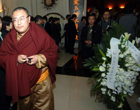 The abbot of Tibetan Buddhist Guangren Temple arrives at the funeral of Xiong Ning in Xi'an, Shaanxi Province, March 16, 2008. Xiong Ning died in a road accident March 10 on her way to distribute disaster relief supplies in Yushu Tibet Automomous Prefecture in Qinghai Province. [Xinhua]
