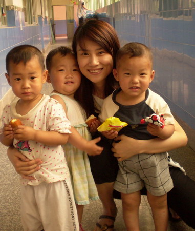 Volunteer Xiong Ning poses with children at the Xi'an Orphanage in Shaanxi Province in this photo taken on June 7, 2007. Xiong Ning died in a road accident March 10 on her way to distribute disaster relief supplies in Yushu Tibet Automomous Prefecture in Qinghai Province. [Xinhua]