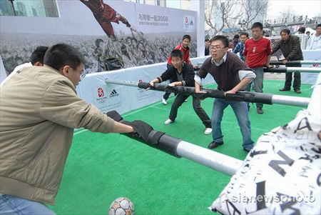 People play a human fooseball game in front of a department store in Hangzhou, East China's Zhejiang Province, March 16, 2008. [Xinhua]