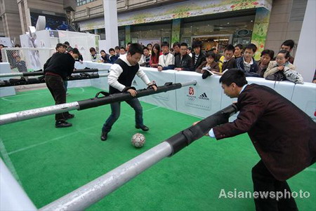 People play a human fooseball game in front of a department store in Hangzhou, East China's Zhejiang Province, March 16, 2008. [Xinhua]