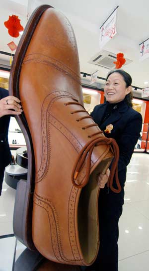 A staff worker turns the huge shoe up at a store in Chuzhou City, East China's Anhui Province, March 19, 2008. The 130-centimeter-long and 48-centimeter-high leather shoe attracted many citizens. [People's Daily Online]