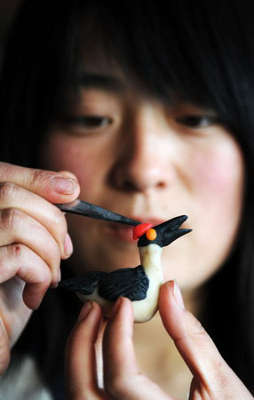 A folk artist makes a crane-shaped creation at the Gonghui fair in Lanxian County, North China's Shanxi Province, March 26, 2008. People display their dough sculptures on a 200m-long shelf along the main street during the fair, to give the public an opportunity to admire their creations. [Xinhua]