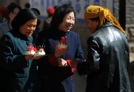 People look at creations made of dough at the Gonghui fair in Lanxian County, North China's Shanxi Province, March 26, 2008. Folk display their dough sculptures on a 200m-long shelf along the main street during the fair, to givethe public an opportunity to admire their creations.[Xinhua]