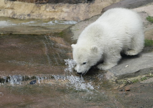 Polar bear cub Flocke (snowflake) drinks water after entering her new outside enclosure for the first time at the zoo in Nuremberg on April 8, 2008. [Agencies]