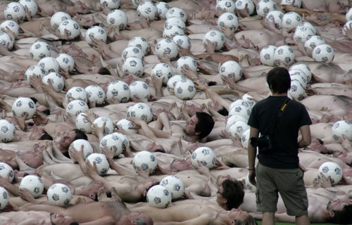 People pose with soccer balls during a performance at the Ernst Happel soccer stadium in Vienna May 11, 2008. About 1,800 people stripped naked on Sunday for US photographer Spencer Tunick at the stadium that will host the Euro 2008 soccer final. [Agencies]