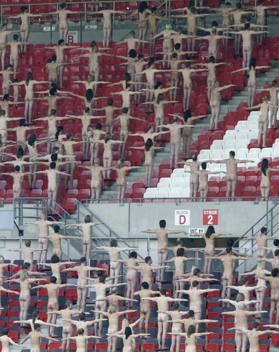 People pose during a performance at the Ernst Happel soccer stadium in Vienna May 11, 2008. About 1,800 people stripped naked on Sunday for US photographer Spencer Tunick at the stadium that will host the Euro 2008 soccer final. [Agencies]