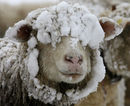 A snow-covered sheep stands on a meadow during snowfalls near the Albispass mountain pass south of Zurich November 22, 2008. [Agencies]