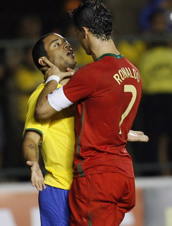 Portugal's Cristiano Ronaldo holds the neck of Brazil's Marcelo during their international friendly soccer match in Brasilia November 19, 2008. [Agencies]