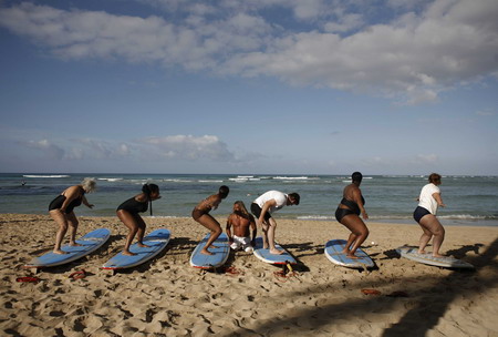 Tourists take a surfing lesson before they hit the waves off Waikiki Beach in Honolulu, Hawaii April 22, 2008. [Agencies]