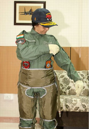 India's President Pratibha Patil gets ready to fly in the Sukhoi 30 MKI fighter aircraft before entering the cockpit of a Sukhoi fighter aircraft at an air force station, in Pune, India, Wednesday, Nov. 25, 2009. Patil flew in the fighter jet Wednesday becoming the country's first woman to fly in a combat plane, reports said.[CFP]