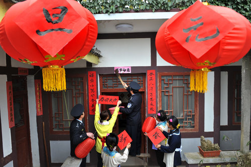 Policemen help a family of the Buyi ethnic group to post couplets on the door ahead of New Year in Guiyang, southwest China's Guizhou province, December 30, 2009.[Photo/CFP] |