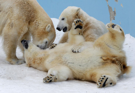 One-year-old twin polar bears Ikor and Kiroru play with their mother Rara in Sapporo, northern Japan, January 18, 2010..[Agemcies]