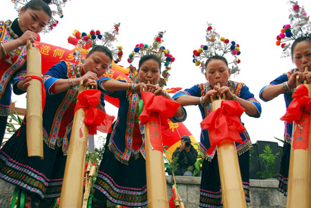 Several Dong women perform "Ditong", a traditional wind instrument, at a plaza of Sanjiang Dong autonomous county, south China's Guangxi Zhuang autonomous region, Feb 21, 2010. [Photo/Xinhua]