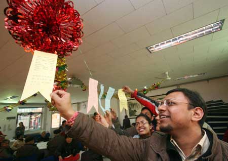 An international student from India tries to work out a lantern riddle in Tianjin February 25, 2010. China is welcoming the Lantern Festival which falls on Sunday. Riddle solving is beloved by Chinese during the festival. [Photo/Xinhua] |