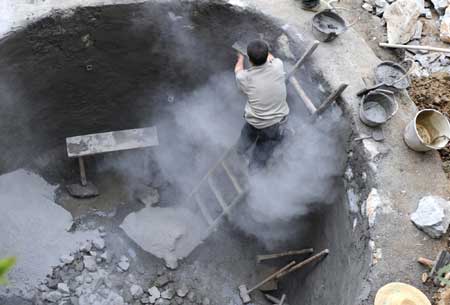 Villagers work to construct a water storage tank in the drought-plagued Hechi city of Guangxi Zhuang autonomous region, March 28, 2010. [Photo/Xinhua]