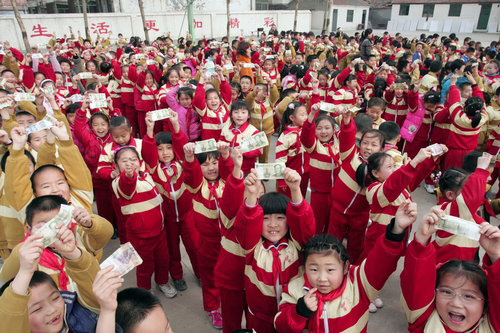 Children at a primary school in Jining, Shandong province, pose with the bills they will donate to the drought-hit areas on March 29, 2010. [Photo/CFP]