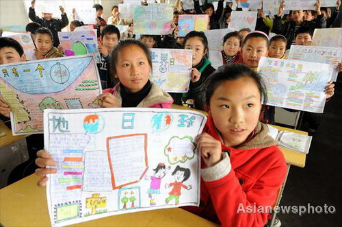 Pupils at Weiwu primary school in Bozhou, Central China’s Anhui province, presented drawings to welcome the upcoming 41st World Earth Day which falls on April 22 [Photo/Asianewsphoto]