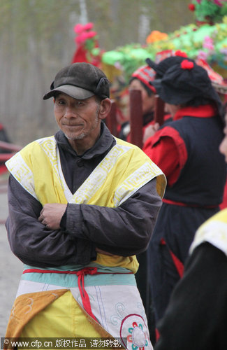 A folk artist rests during the rehearsal of Paoweizi, an old folk dance, in Anyang, Central China's Henan province, April 20, 2010. [Photo/CFP]