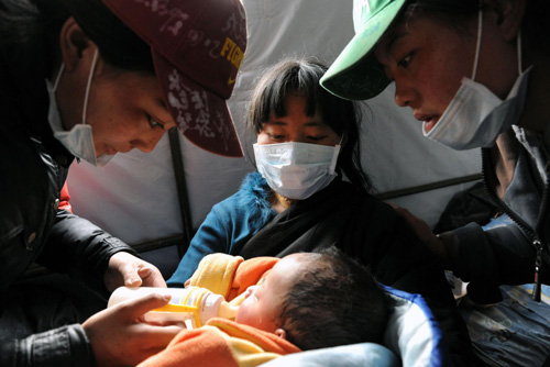 Two volunteers help a mother feed her injured baby in Yushu, Northwest China's Qinghai province on April 21, 2010. [Photo/Xinhua]