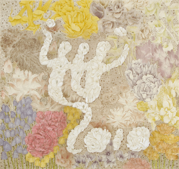 A painting by artist Wang Luping from the Chinese Painting Academy, uses different flowers to represent different regions and countries. For example the cherry blossom represents Japan and peonies for China. And under the integrated pattern of white magnolia, a flower to represent the city of Shanghai, as well as the Expo Emblem, which depicts the images of three people: you, me, him/her holding hands together. It took the artist three months to finish the painting, which measures at 1.2 * 1.2 meters, and he named the painting “Flowery World Embraces Expo.” [Photo/Wang Luping] |