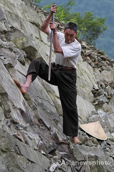 Pan Yunbao, a 63-year-old villager, cuts rocks for the rebuilding of the flood-battered road in Yuantoutun, June 25, 2010. [Photo/Asianewsphoto]