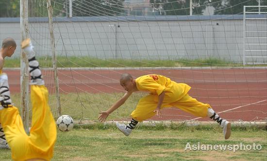 A student tries to score in a soccer match held by Shaolin Tagou Martial Art Institute in Dengfeng, Central China's Henan province on July 7, 2010. [Photo/Asianewsphoto] |