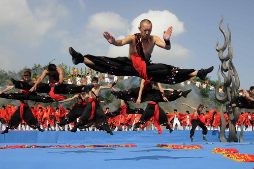 Actors perform during the sixth Yi ethnic group International Torch Festival in Xichang city, Sichuan province on August 4, 2010.[Photo/Xinhua]
