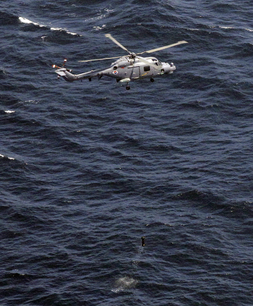 South Korea Navy's Lynx helicopter carry a sonar (sound navigation and ranging) to find submarines during a military drill in the West Sea of South Korea August 5, 2010. [Photo/Agencies]