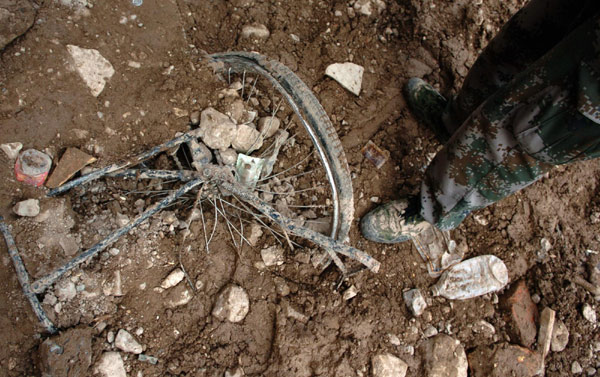 A bicycle wheel sinks in the mud, Aug 9, 2010. [Photo/Xinhua]