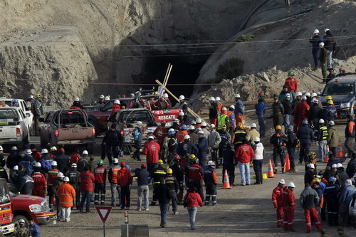 Co-workers, rescuers and relatives gather outside a copper and gold mine where miners are trapped in Copiapo, 725 km (450 miles) north of Santiago, in this August 7, 2010. Thirty-three miners trapped underground for more than two weeks after a cave-in said they are all alive in a message tied to a drill, Chilean authorities said on August 22, 2010.[Photo/Agencies] |