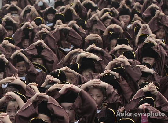 Pupils in traditional costumes make an ancient salute at the Confucius temple in Nanjing, Jiangsu province, Aug 31, 2010. [Photo/Asianewsphoto]