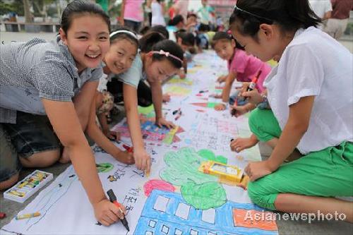 Students draw pictures on the 100-meter canvas to welcome the upcoming 26th National Teachers' Day in Weiwu Square, the central area of Bozhou city, Anhui province on Sept 3, 2010.[Photo/Asianewsphoto]