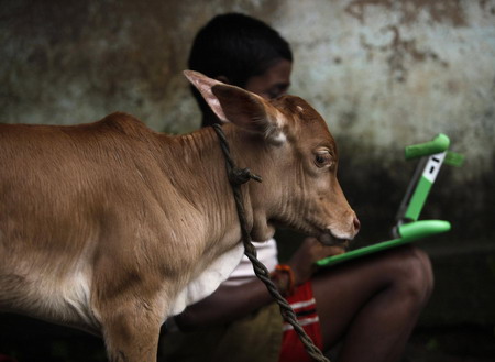 A schoolboy uses a laptop provided to him under 'one laptop per child' project by non-governmental organisation (NGO) as a calf stands near in a primary state-run school on the eve of International Literacy Day at Khairat village, about 90 km (56 miles) of Mumbai September 7, 2010. [Agencies]