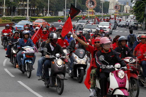 ![]() Thai anti-government "red shirts" massed for a mobile rally in Bangkok, October 17, 2010, the latest in a series of provocative gatherings banned under strict emergency laws. Activists rode around Bangkok on trucks and motorcycles to protest the detention of the group's leaders and scores of demonstrators held since deadly military offensives to end 10 weeks of paralysing protests in April and May. REUTERS/Sukree Sukplang.[Photo/Agencies] |