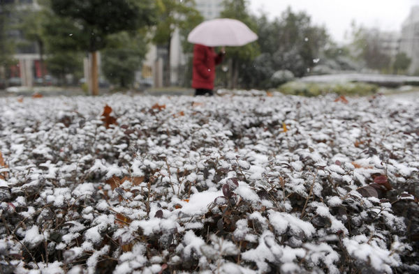 A woman passes by the snow-covered green belt in Hefei, capital of central China's Anhui province, Dec 15, 2010. Anhui Meteorological Bureau issued blue warning signal for snowstorm at 11:00 am Dec 15, 2010.[Photo/Xinhua]